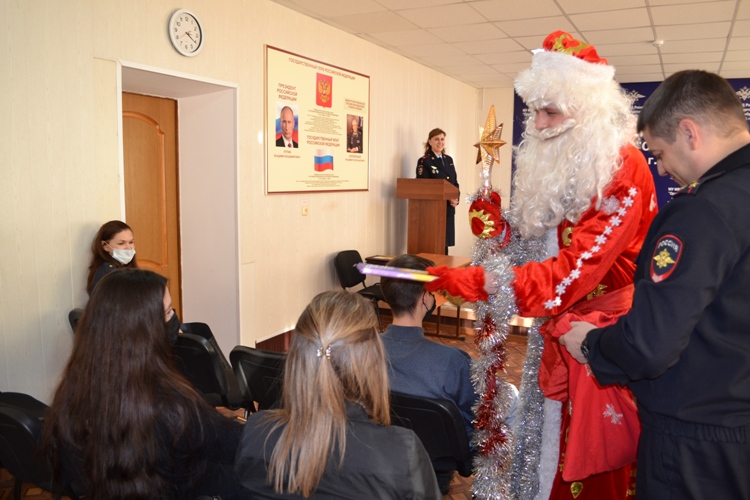 Неожиданным сюрпризом для присутствующих стало появление Полицейского Деда Мороза, который поздравил всех с наступающим Новым годом и пожелал всего самого наилучшего. Приятным завершением встречи было вручение сказочным персонажем сладких подарков и общая фотография на память с Полицейским Дедом Морозом.