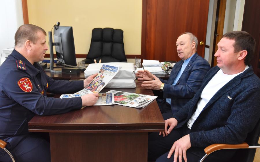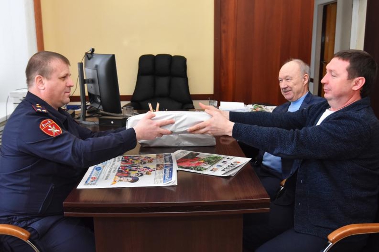 Генеральный директор АО «РИА «Оренбуржье» Олег Сураев и главный редактор газеты «Оренбуржье» Юрий Мещанинов передали первую партию газет «Южный Урал» и «Оренбуржье» начальнику пресс-службы Управления Росгвардии по Оренбургской области подполковнику полиции Василию Иванову.