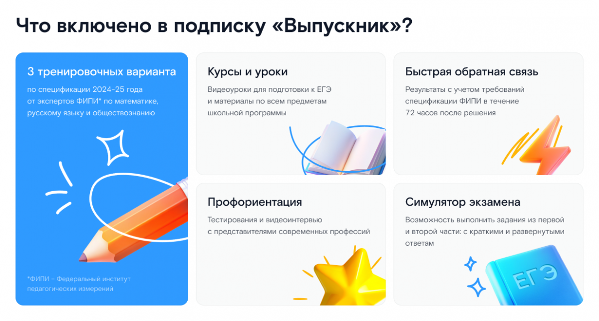 В подписку «Выпускник» входит доступ к видеоурокам для подготовки к госэкзаменам. Старшеклассники смогут изучить материалы и проверить свои знания перед сдачей экзаменов по русскому языку, математике профильного уровня и обществознанию. По каждому из этих предметов один раз месяц можно решать актуальные на 2024–2025 учебный год варианты заданий, разработанные Федеральным институтом педагогических измерений (ФИПИ), с последующей проверкой развернутых ответов членами предметных комиссий ЕГЭ. Процедура выполнения заданий максимально приближена к условиям реального экзамена: во время тестирования запускается счетчик времени, а также используется формат бланков ЕГЭ. В течение 72 часов после выполнения заданий ученик получит результаты, а также статистику по каждому заданию и каждой теме варианта в соответствии с требованиями спецификации ФИПИ.