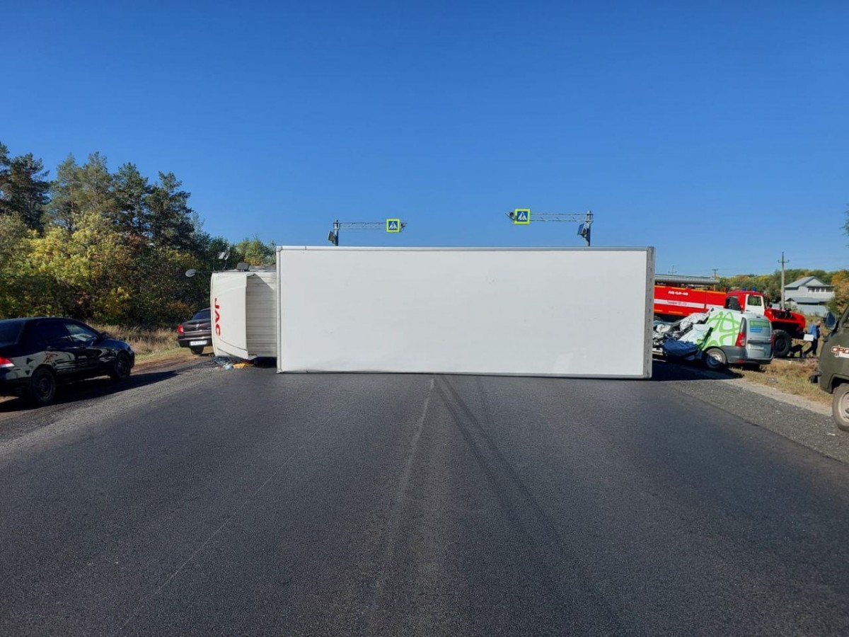 Сотрудники полиции, прибывшие на место, предварительно установили, что при встречном разъезде столкнулись три легковых автомобиля и фура. В результате столкновения фура опрокинулась на проезжую часть.