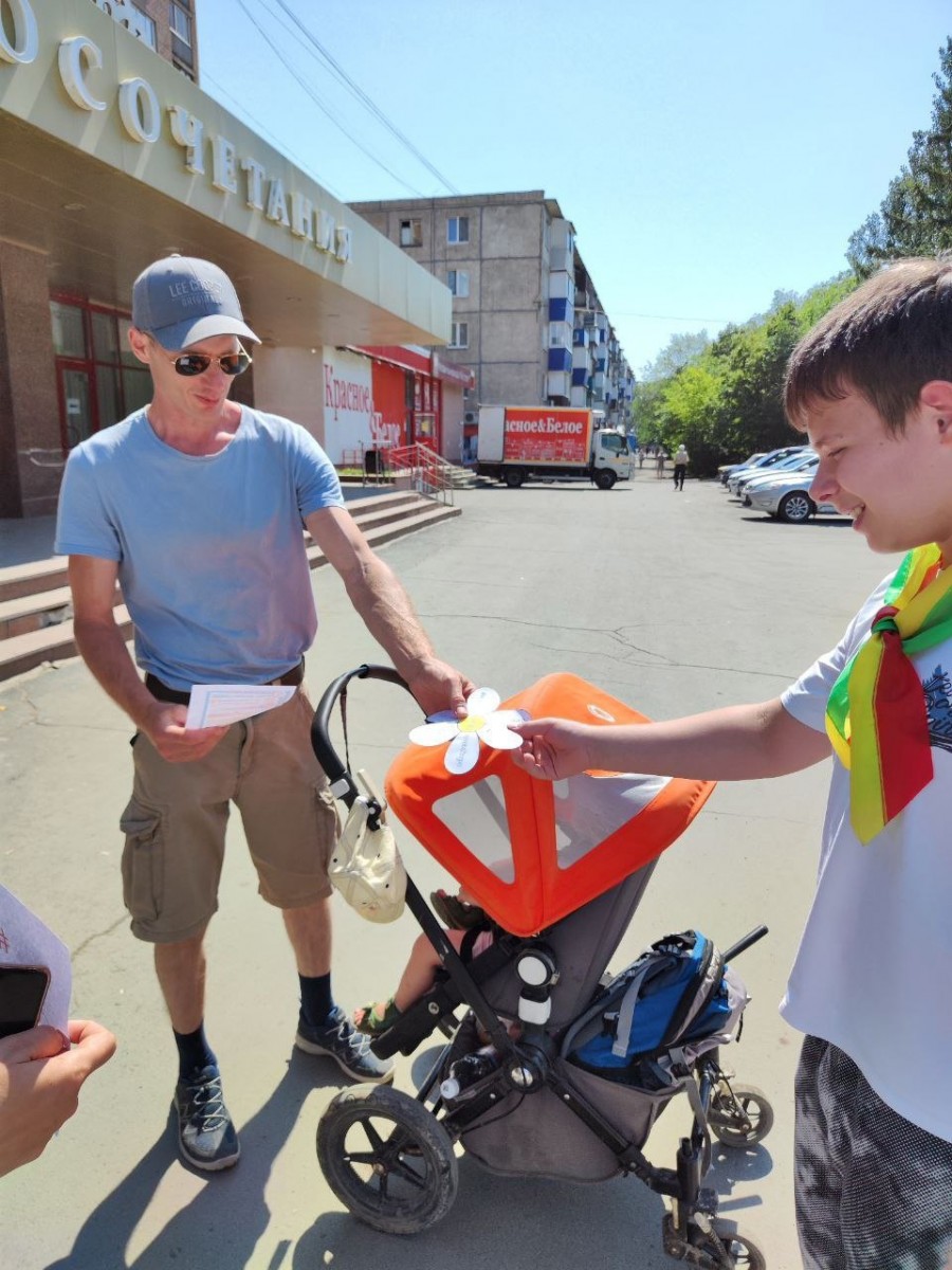 Мероприятие прошло перед домом бракосочетания города Орска, инспектор и ребята вручали семьям, заранее изготовленные, ромашки и тематические памятки.