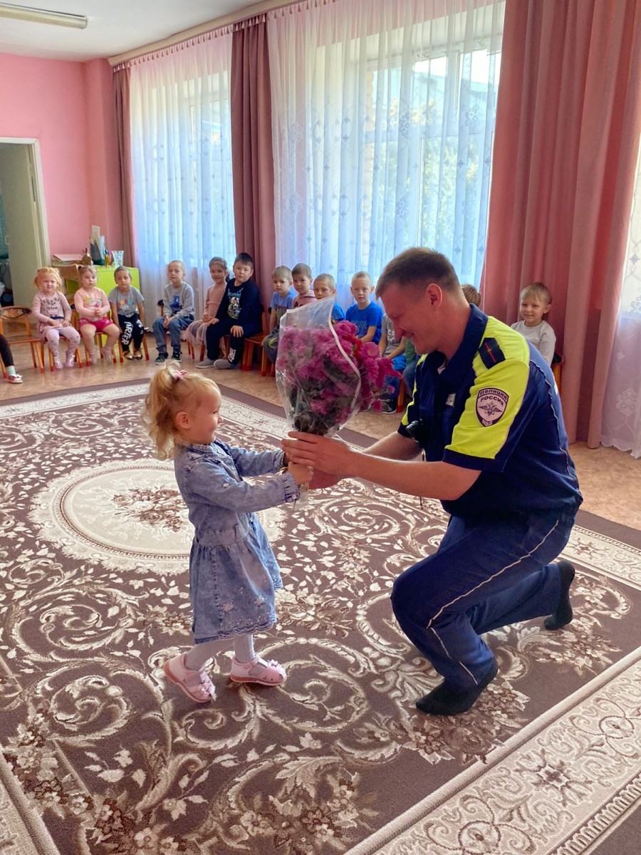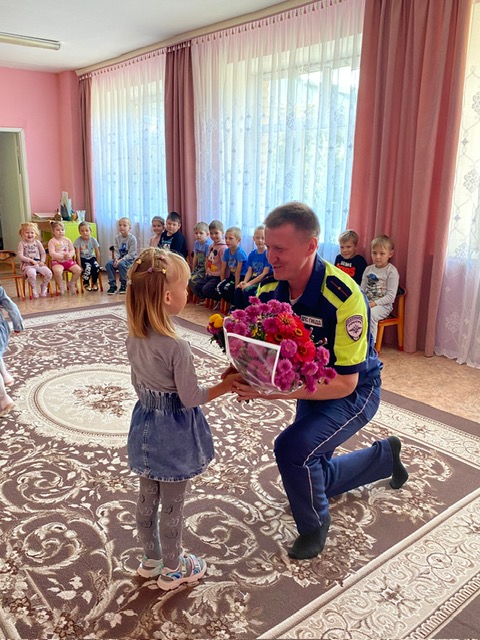 Малыши детского сада с интересом слушали рассказ инспектора о том, как правильно переходить проезжую часть пешеходам, с какого возраста можно передвигаться на велосипеде по улицам поселка, почему перевозить детей нужно обязательно с использованием детских удерживающих устройств, а в темное время суток нужно использовать светоотражающие элементы. Николай Портов донес информацию доступно и интересно. В знак благодарности малыши преподнесли инспектору ОГИБДД цветы.
