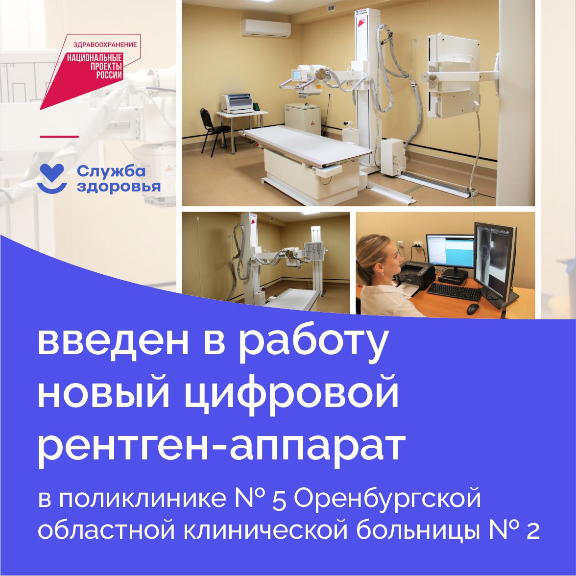 В поликлинике № 5 Оренбургской областной клинической больницы № 2 благодаря региональному проекту «Модернизация первичного звена здравоохранения» (нацпроект «Здравоохранение») введен в работу новый цифровой рентген-аппарат. Диагностический комплекс «МЕДИКС-Р-АМИКО» сменил устаревший плёночный рентген. Новое оборудование полностью отечественного производства, оно дает высокое качество изображения при низкой лучевой нагрузке. Комплекс позволил расширить диагностические возможности и сократить время обследования.