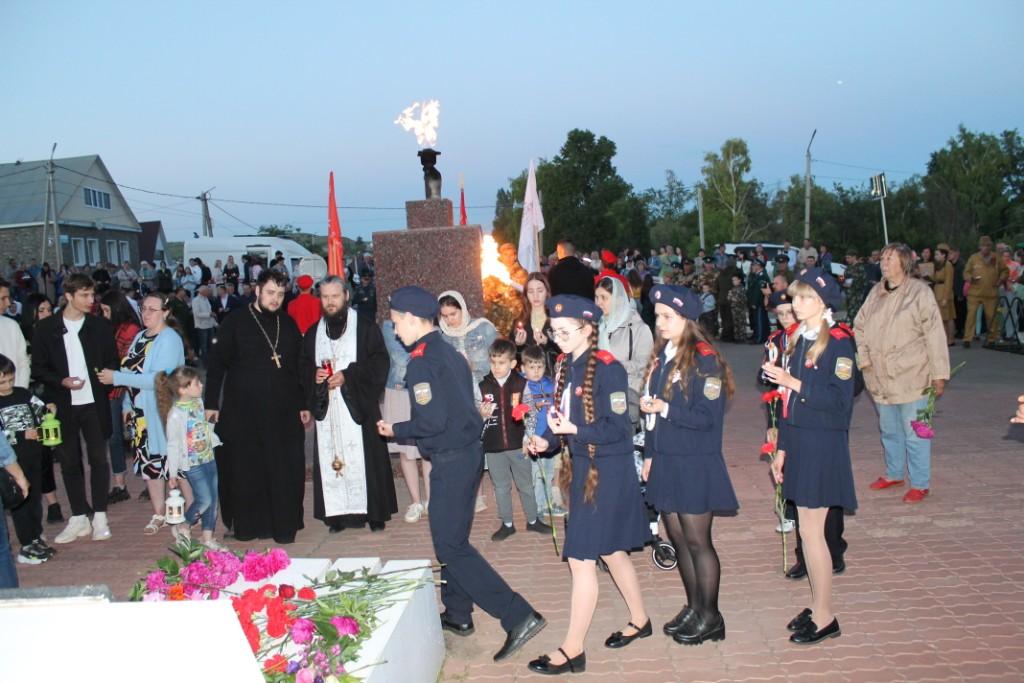 Присутствующие почтили минутой молчания память воинов, погибших на полях сражений и в послевоенные годы. Возложили цветы и установили зажженные свечи к подножию монумента «Славы», и по традиции запустили по реке Большой Кинель венок.