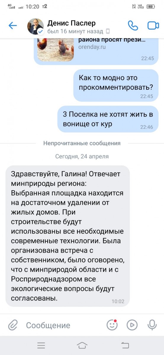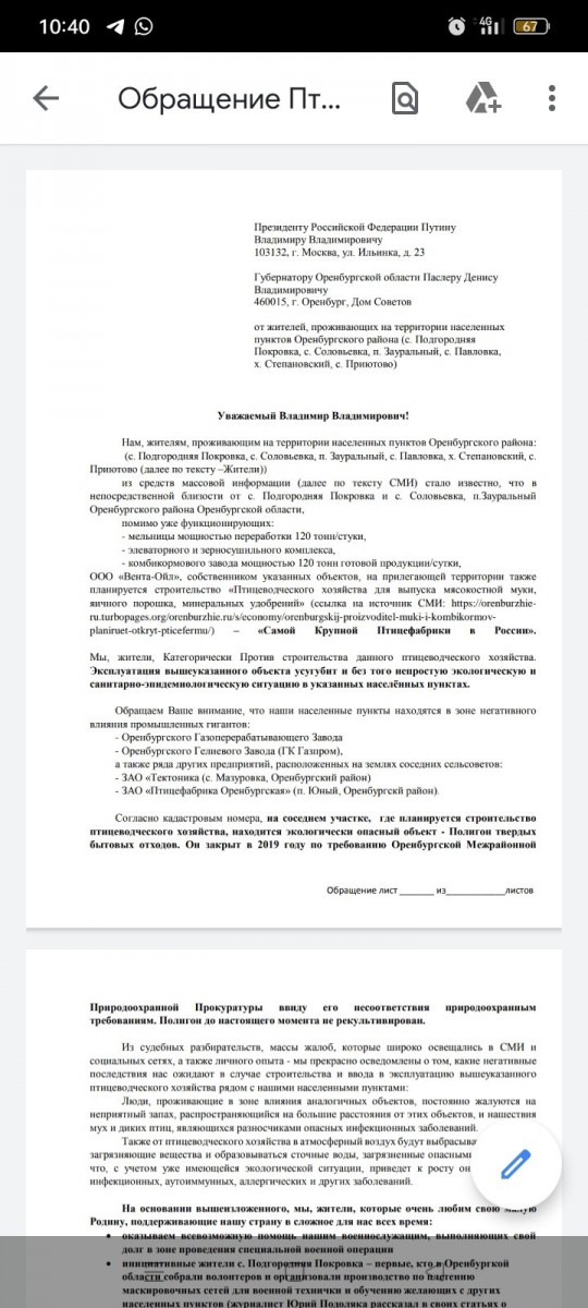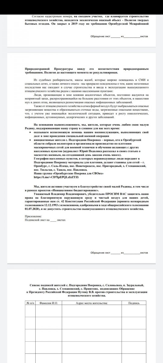 24.04.2023В этом году Губернатор Оренбургской области Денис Паслер анонсировал строительство крупнейшей птицефабрики. Жители сел П.Покровка, Соловьевка, Зауральный выступают категорически против строительства возле места их проживания. Ведь мухи, неприятные запахи – не то, за чем приехали местные жители. При покупке участков обещался чистый воздух и естественная красота загородной жизни.