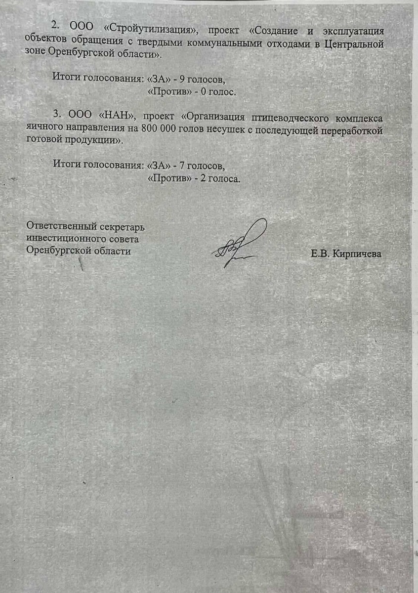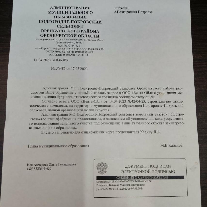 Жители, наблюдая активное начавшееся строительство, сделали запрос к Главам сельсоветов по данному вопросу и получили ответ, что строительство птицеводческого комплекса не планируется. Однако, в блоге Губернатора Оренбургской области Д.Паслера был дан ответ Министерством природных ресурсов, экологии и имущественных отношений Оренбургской области по этому вопросу: